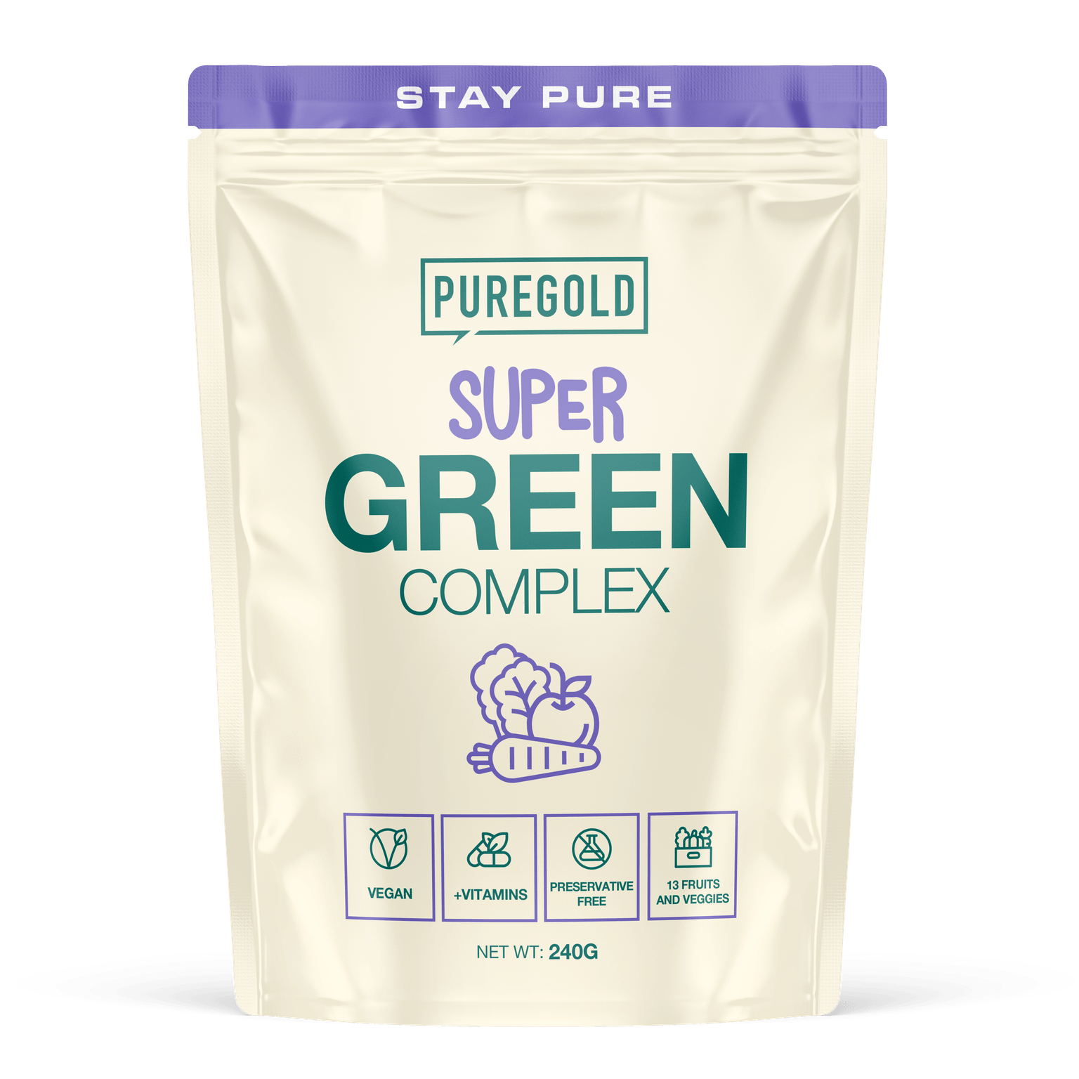 Ingrediente: SuperGreens+ amestec pudră (pulbere de suc de mere, pulbere de fibre de măr, pulbere de spanac, pulbere de broccoli, spirulina [Arthrospira platensis] pulbere, orz - pulbere de iarbă, grâu - pulbere de iarbă, pulbere de kale, moringa [Moringa oleifera] pulbere de frunze, chlorella [Chlorella pyrenoidosa, Chlorella vulgaris] pulbere, pulbere standardizată de fruct de kiwi verde, pulbere de fruct de kiwi auriu, Camu Camu [Myrciaria dubia] pulbere de fruct, kolecalciferol), spirulina (Arthrospira platensis) pulbere, L-aszkorbinsav, retinil-acetát.